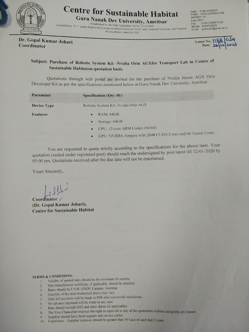 | Sealed quotations are invited for the purchase of Robotic System Kit - NVIDIA Orin AGX in the Centre of Sustainable Habitat,Guru Nanak Dev University, Amritsar. |