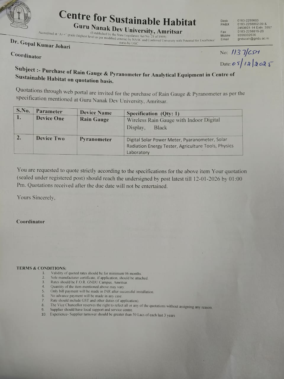 | Sealed quotations are invited for the purchase of Rain Gauge and Pyranometer for Analytical Equipment in the Centre of Sustainable Habitat,Guru Nanak Dev University, Amritsar. |