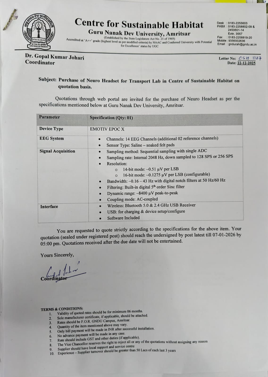 | Sealed quotations are invited for purchase of Neuro Head set in Centre of Sustainable Habitat,Guru Nanak Dev University, Amritsar. |