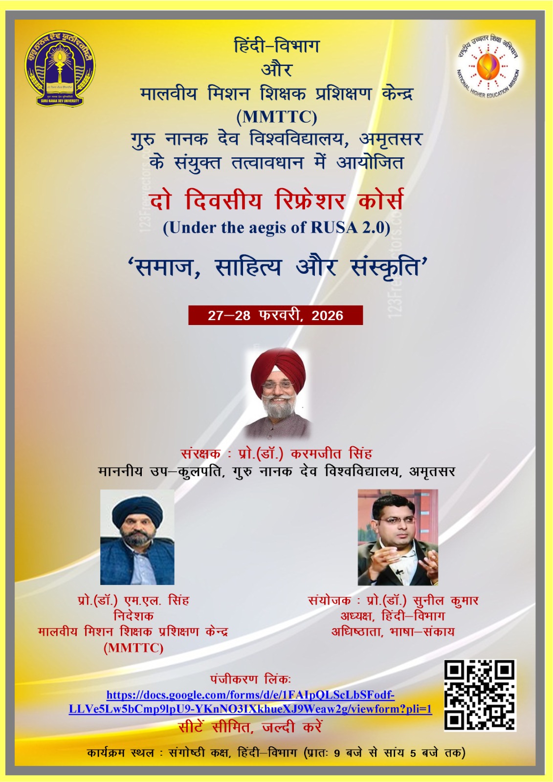 • Departmemnt of Hindi, Guru Nanak Dev University, Amritsar and Bharat Vikas Parishad is going to organize "Kutumb Parbhodan" to be organised on 15 June, 2025 at Guru Nanak Bhawan, GNDU Campus, Amritsar. (uploaded on 13/06/2025) Click here for details