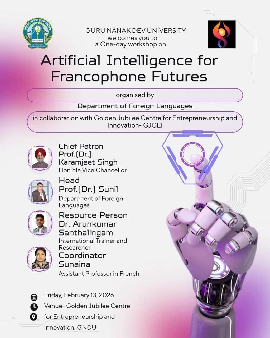 • Departmemnt of Foreign Languages, Guru Nanak Dev University, Amritsar is going to organize One Day Workshop on "Artificial Intelligence for Francophone Futures" in collaboration with Centre for Enterpreneurship and Innovation-GJCEI on 13 Feb., 2026. (uploaded on 16/02/2026) Click here for details